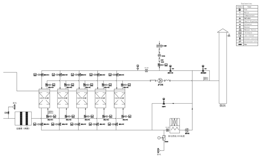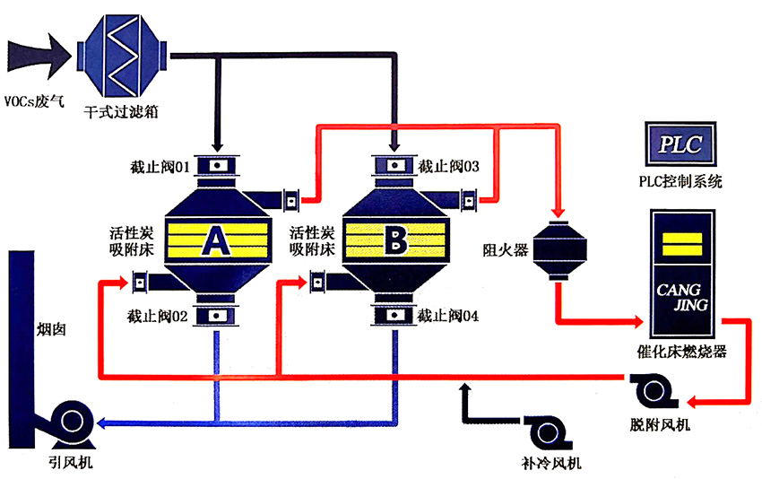 本凈化裝置采用雙氣路連續(xù)工作,設(shè)兩個(gè)或多個(gè)吸附床可交替使用,先將有機(jī)廢氣用活性炭吸附,當(dāng)快達(dá)到飽和時(shí)停止吸附操作,然后用熱氣流將有機(jī)物從活性炭上脫附下來使活性炭再生;脫附下來的有機(jī)物已被濃縮并送入催化燃燒室轉(zhuǎn)化成CO2和H2O排出,當(dāng)有機(jī)廢氣濃度合適的情況下,有機(jī)廢氣可維持自燃,不用外加熱,燃燒后的尾氣一部分排入大氣,大部分送往吸附床,用于活性炭的脫附再生。這樣能滿足燃燒和脫附所需的熱能,達(dá)到節(jié)能的目的,再生后的活性炭也可用于下次吸附。裝置既適合于連續(xù)操作,也適合于間斷操作。